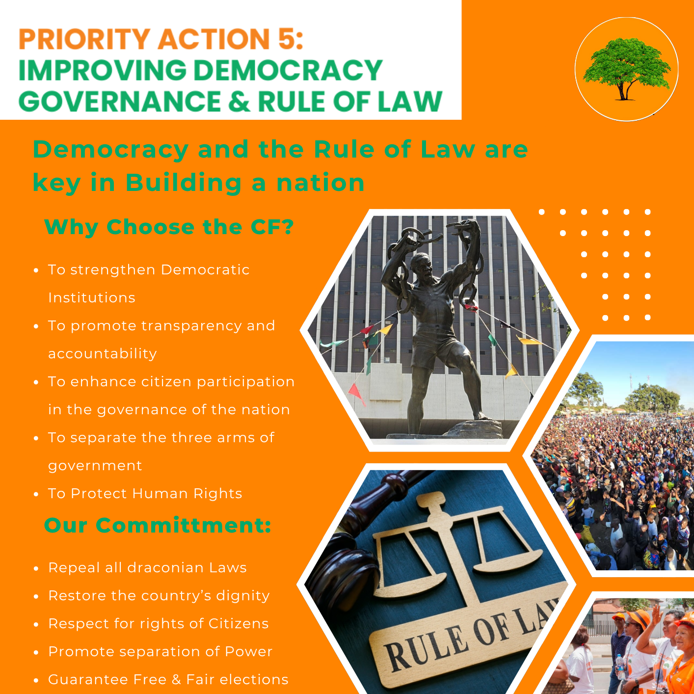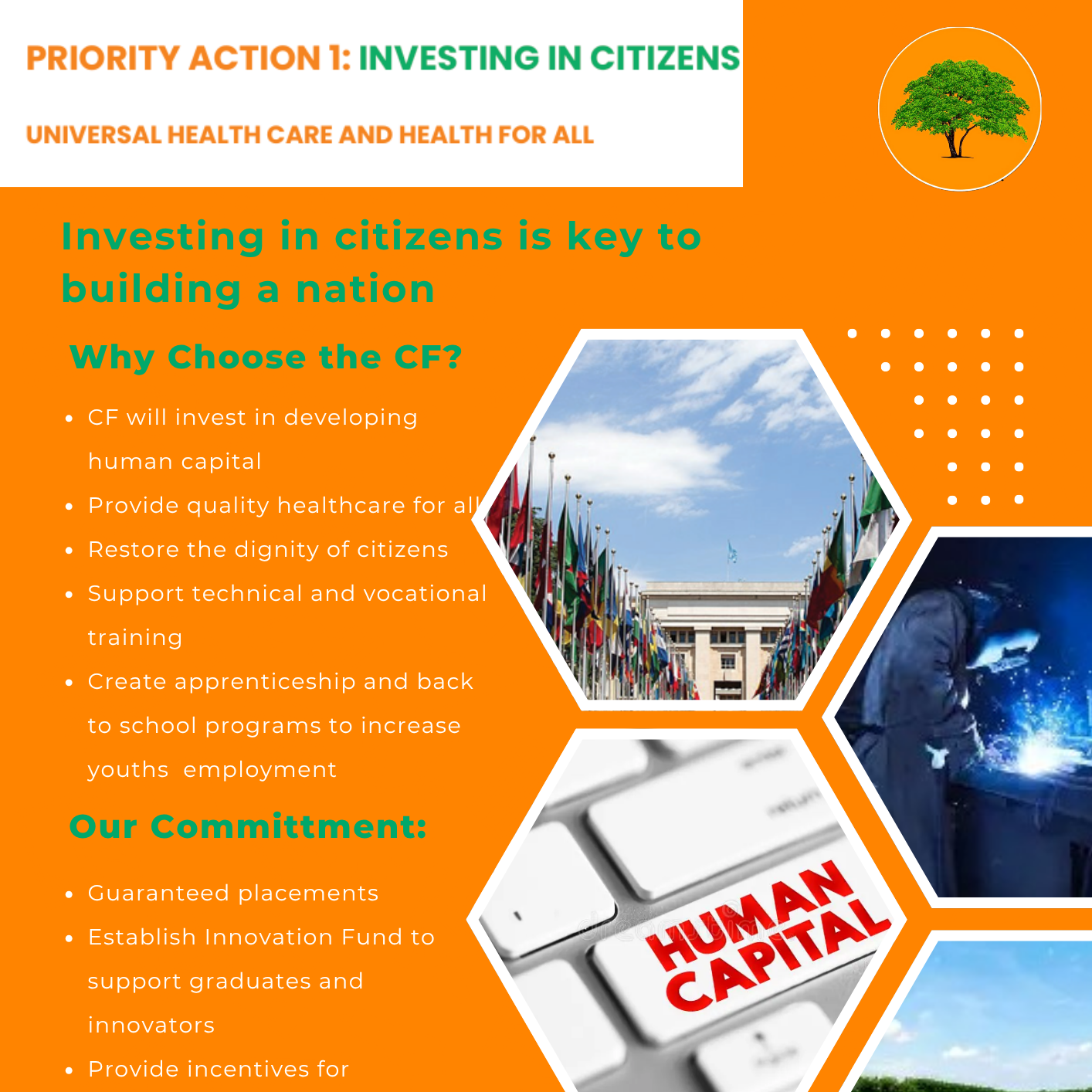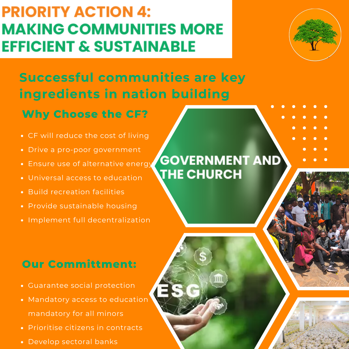 Citizen First has placed sustainable community development at the center of its agenda for both urban and rural areas, aiming to uphold human dignity while investing in infrastructure and programs that strengthen well-being, human development, and national progress. The party is committed to building lasting community assets that improve quality of life and empower residents to thrive.